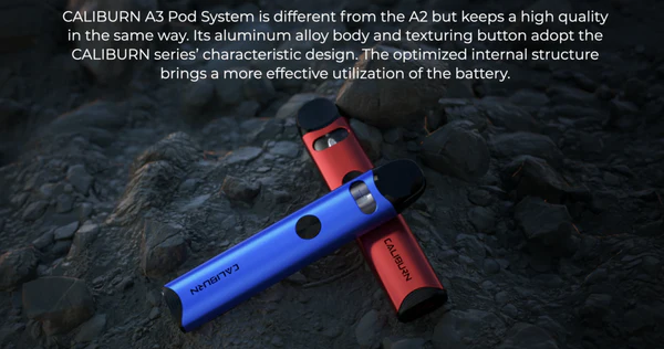 CALIBURN A3 พอตบุหรี่ไฟฟ้าที่ถูกออกแบบมาเน้นการใช้งานง่าย พกพาสะดวก จ่ายไฟได้ 13W มาพร้อมแบตเตอรี่ในตัวขนาด 520 mAh มีหัวพอตพร้อมคอยล์ขนาด 1.0 ohm แถมมาให้อีกหนึ่งหัวในกล่อง มีความจุ 2ml ให้ฟีลสูบ MTL (Mouth to Lung) ตามแบบฉบับของ คาริเบิน A3