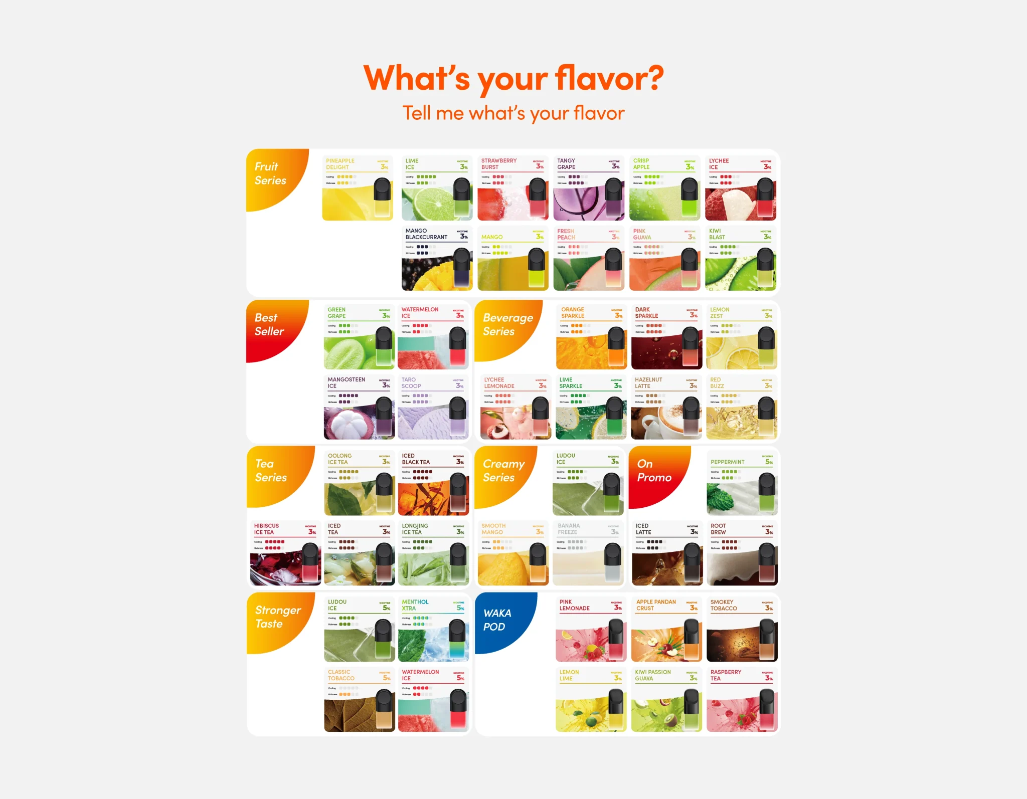 หัวพอต RELX Pro 2 Pod Juice มีให้เลือกหลายรสชาติเพื่อให้เหมาะกับรสนิยมที่แตกต่างกัน ไม่ว่าคุณจะชอบรสหวานและกลิ่นผลไม้หรือกลิ่นมิ้นต์เย็นๆ มีถึง 30 กลิ่นรสชาติให้เลือกใช้งานหลากหลายดังนี้