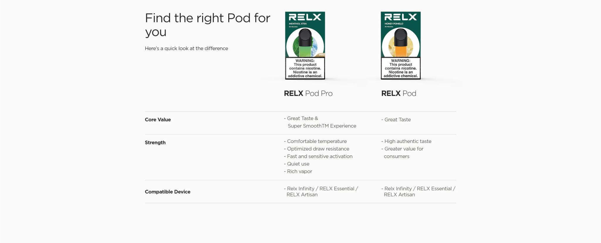เป็นแบรนด์ที่ทำพวกเครื่อง พอตระบบปิด / หัวพอต / และอีกไม่นานจะมี พอตใช้แล้วทิ้งออกมาให้ลิ้มลองกันแน่ ค่าย RELX คุณภาพระดับพรี่เมี่ยมกลิ่นชัดติดปากนิคมาเต็มทุกตัว ออกสินค้ามาใหม่คุณภาพดีเยี่ยมไม่แพ้อย่างค่ายคู่แข่ง KS เลยถือว่าเป็นคู่แข่งกันมาตั้งแต่ยุคเริ่มต้น