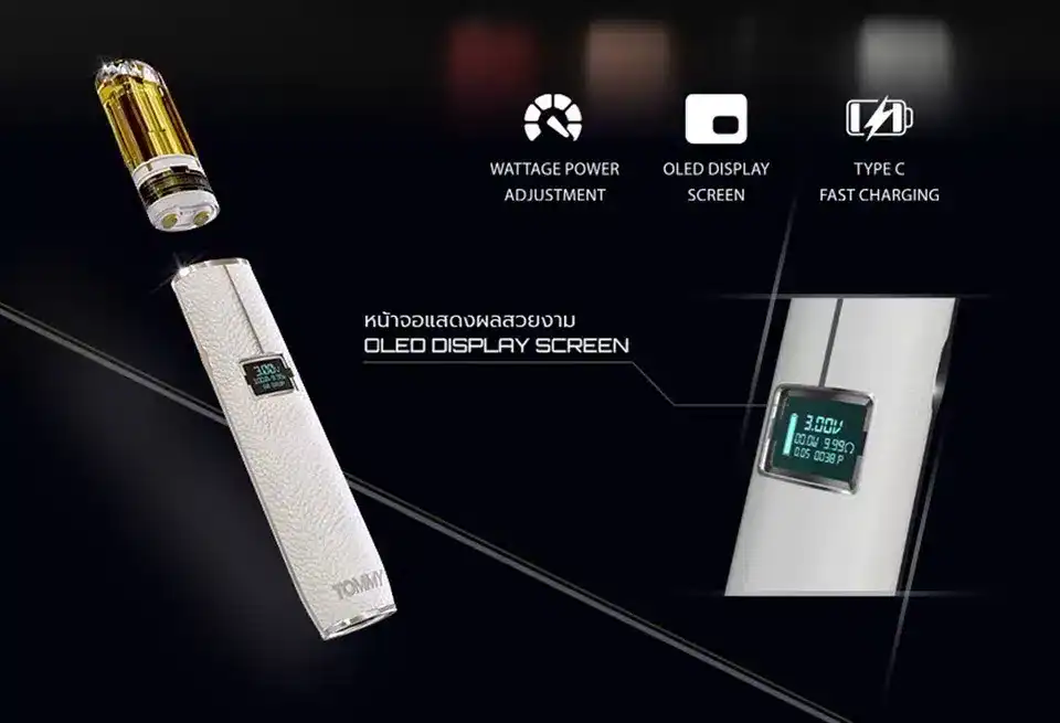 Tommy R1 บุหรี่ไฟฟ้าจากแบรนด์น้องใหม่ที่เปิดตัวออกมาได้ไม่นาน แต่มีความโดดเด่นกว่าพอตเปลี่ยนหัวจากแบรนด์อื่นๆ โดยเฉพาะในส่วนของหน้าจอแสดงผล ที่มาในรูปแบบ OLED เพื่อแสดงข้อมูลการทำงานต่างๆ ของเครื่อง ถึงแม้จะมีขนาดเล็ก และอ่านค่ายากไปสักหน่อย แต่ข้อมูลที่แสดงก็ค่อนข้างตรง ซึ่งมีประโยชน์มาก เพราะรุ่นอื่นจะใช้ระบบไฟ LED ที่อ่านค่ายากกว่า ให้คุณสามารถตรวจสอบสถานะได้ตลอดเวลา